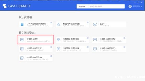 成功连接VPN后,点击“数字图书资源”(见下图)可访问图书馆数字资源导航页,或直接输入数据库网址(如CNKI、维普)亦可访问。